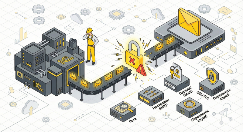 Авторизация по SMTP в 1С‑Битрикс чаще всего «ломается» в самый неподходящий момент: письма перестают уходить, CRM не отправляет уведомления, формы обратной связи молчат. Сообщение «Ошибка авторизации SMTP» выглядит одинаково, но причины могут быть разными — от неверного пароля до устаревшего TLS на сервере или блокировок со стороны провайдера почты. Ниже собрали проверенный сценарий диагностики и исправления, которым пользуемся на реальных проектах в 2024–2025 годах. Он подходит для обычного хостинга, VPS и окружения BitrixVM 9 (упоминаем для актуальности, без привязки к конкретной сборке).