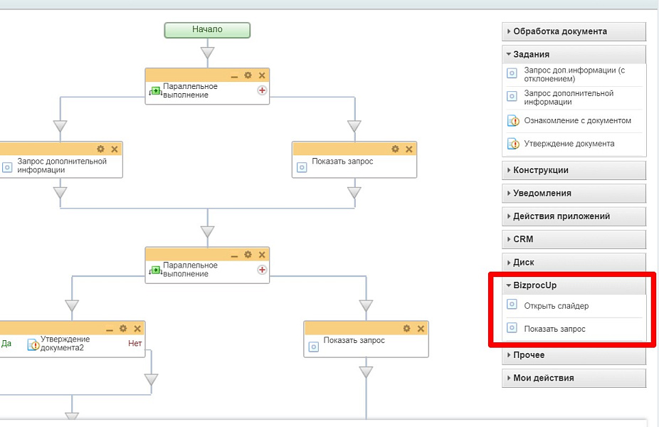 После установки модуля в редакторе бизнес-процессов появляются дополнительные блоки - "Показать запрос" и "Открыть слайдер".