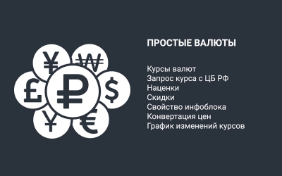 Решение "Простые валюты" больше подходит для торговых каталогов, не подразумевающих онлайн-продажи через интернет. Может использоваться для отображения стоимости продукции в каталоге или услуги, ценообразование которой формируется на основании иностранной валюты.