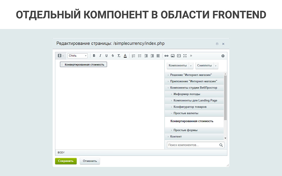 Для фронтальной части сайта может использоваться как простой компонент, так и API модуля. В настройках модуля указана подробная инструкция, как установить компонент в список и карточку элементов. Также можно настроить работу модуля в фоновом режиме, не изменяя компоненты, просто настроив автоматическое обновление цен.