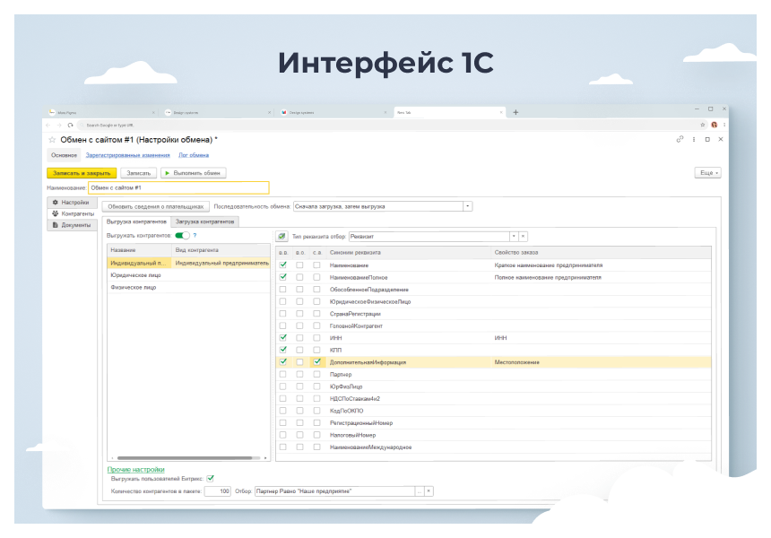 и позволяет пользователям производить передачу контрагентов, сотрудников и документов из 1С в B2B платформу.