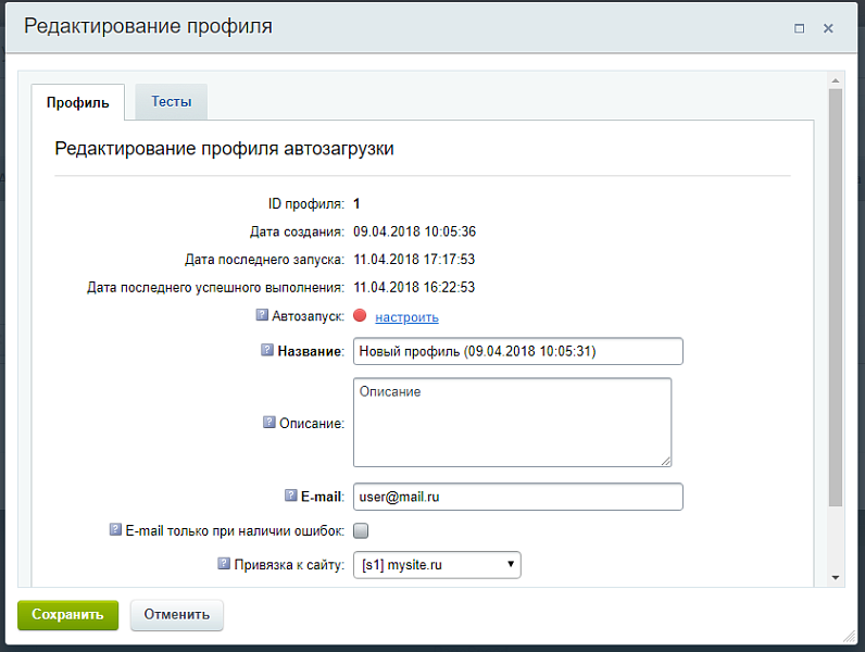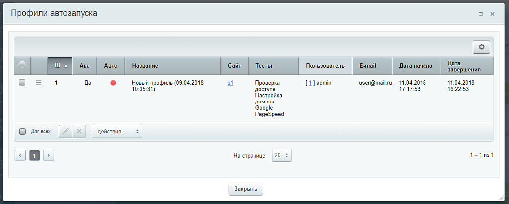 Для выполнения задачи автоматически разработана система профилей: для каждого профиля можно выбрать привязку к нужному сайт, выбрать свой набор тестов, указать свой email, и задать свою периодичность выполнения.