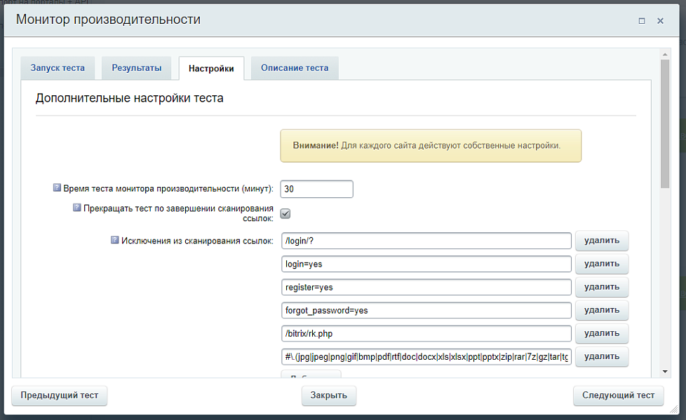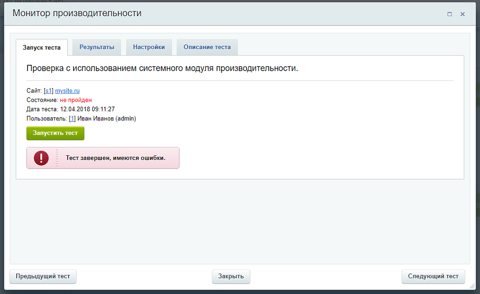 Очень важным нюансом модуля является расширяемая система тестов: каждый тест это плагин, и на любом сайте разработчик имеется возможность создавать свои тесты. Подробности смотрите в руководстве к модулю.