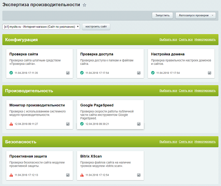 Модуль разработан для регулярного мониторинга сайта и своевременного обнаружения проблем, связанных с конфигурацией, производительностью и безопасностью.