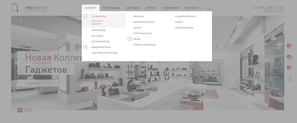 - Удобное выпадающее меню с раскрывающимися списками позволяет достаточно информативно отображать весь каталог.