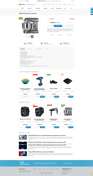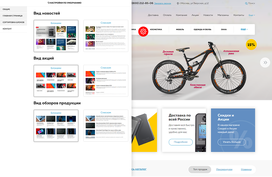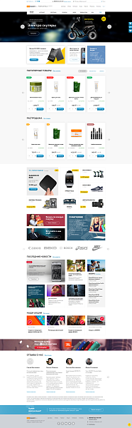 - Блок "Популярные товары", "Распродажа" "Новости", "Акции", "Обзоры", "Отзывы"