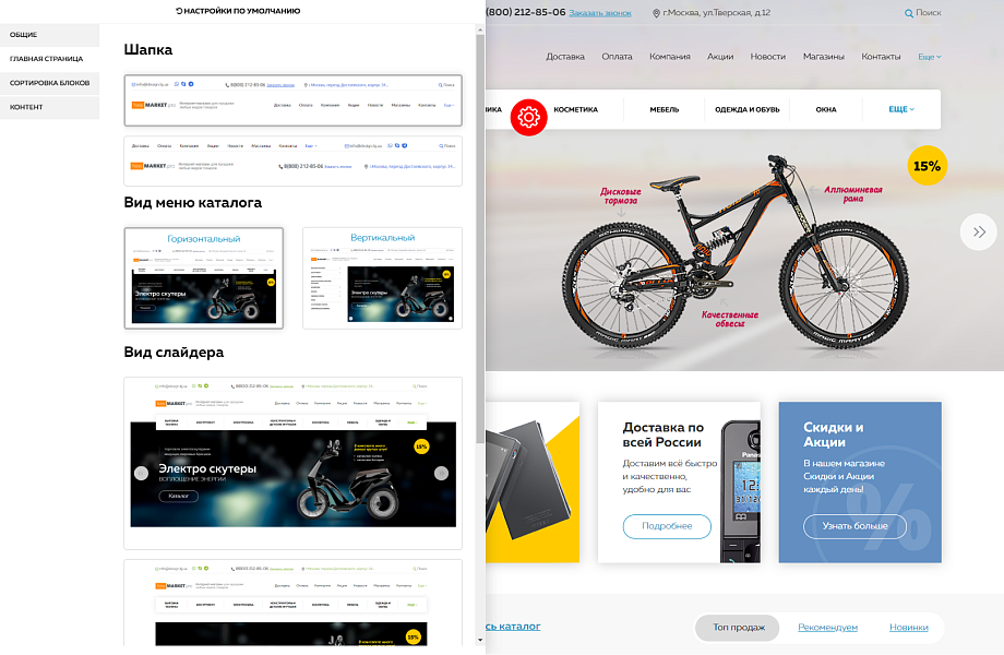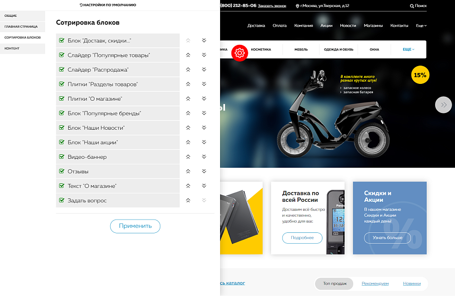Для быстрой настройки главной страницы мы предусмотрели панель (слева шестерёнка на демо-версии), с помощью которой вы сможете изменять структуру и дизайн сайта.