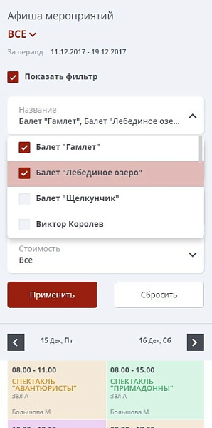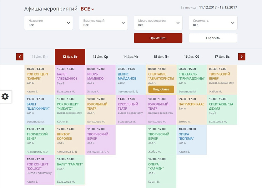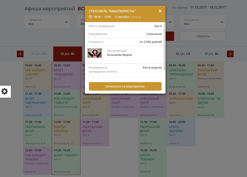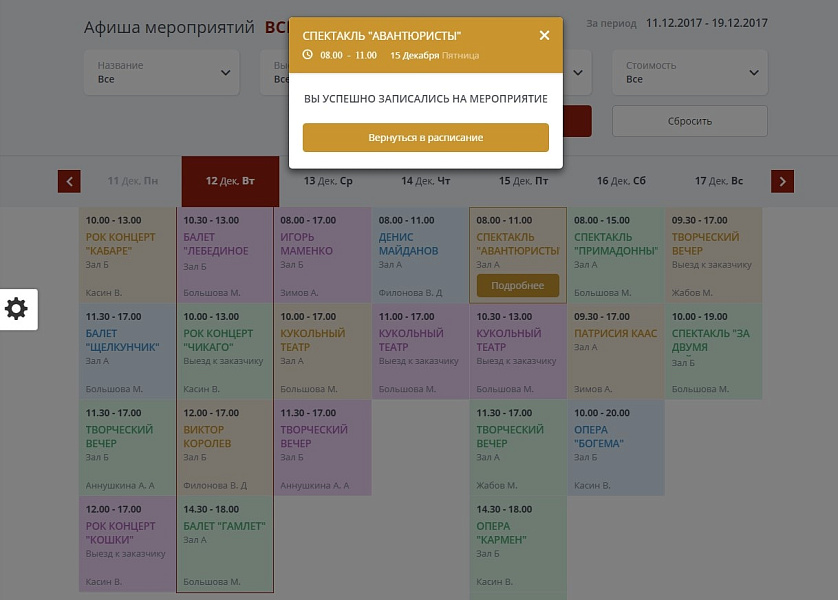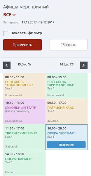 - Модуль расписания (афиша) позволяющий создать полноценное расписание с возможностью записи на различные проводимые концерты, спектакли, мероприятия, а также забронировать билет.