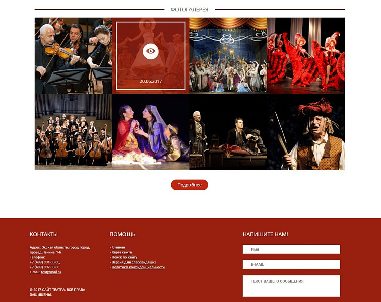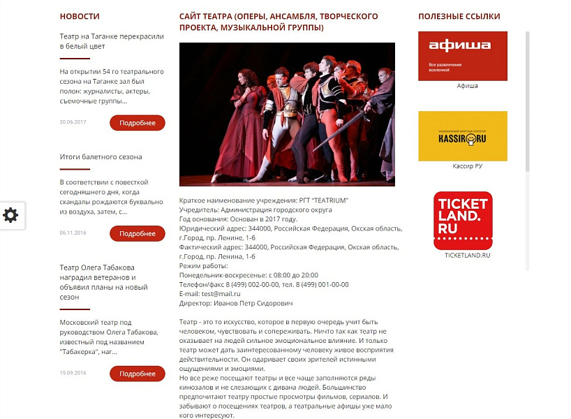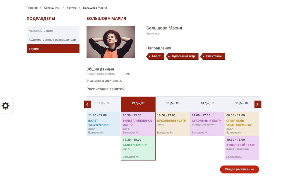 - Для каждого направления (жанра) предусмотрен собственный раздел, в котором отображается список актеров, играющих в этом жанре и афиша спектаклей.