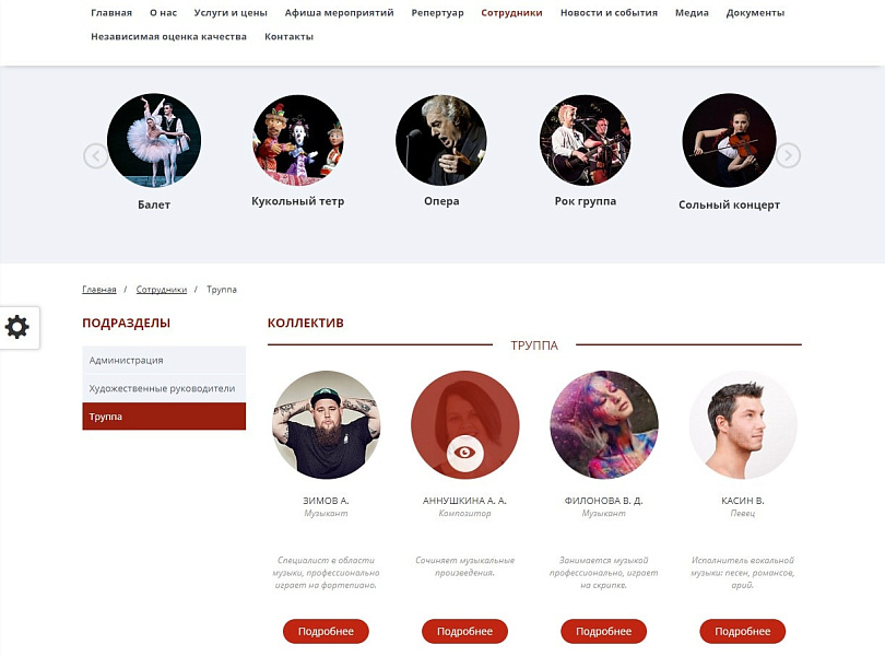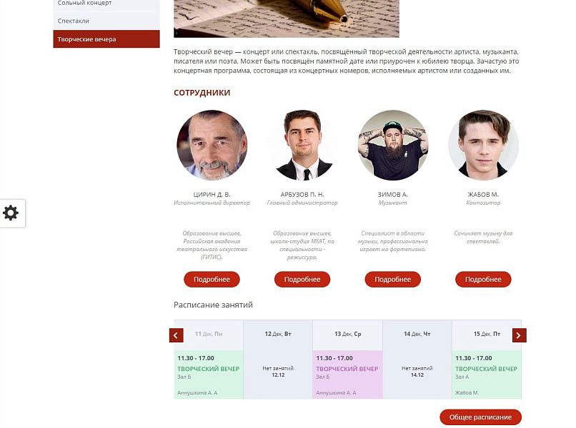 - Личная страница каждого исполнителя (музыканта, артиста) с подробной информацией, с его заслугами и наградами, а так же блоком афиши мероприятий с возможностью записи.
