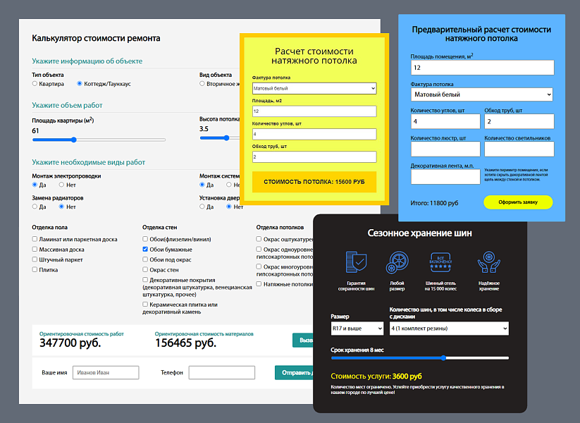 Примеры созданных калькуляторов в конструкторе