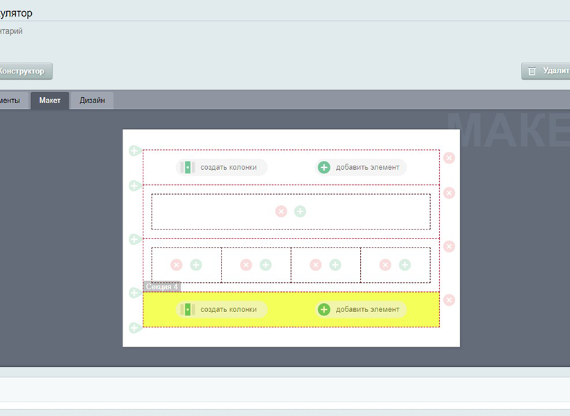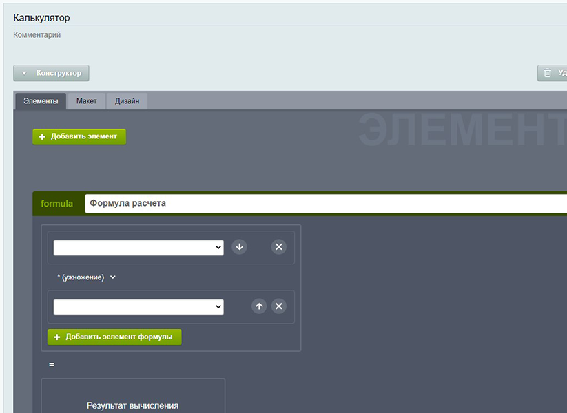 ![]() | Макет Макет калькулятора для размещения элементов формируется как таблица. При необходимости можно вставить произвольный HTML.