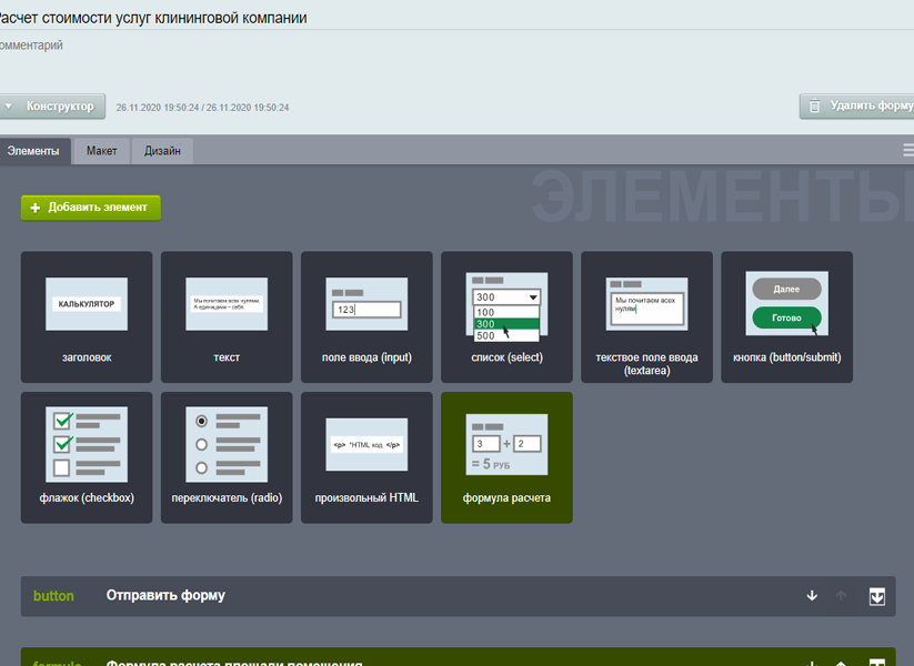 | Элементы В конструкторе доступны: "формулы расчета", "поля ввода", "списки", "кнопки", "переключатели", "флажки", "загрузка файлов", "заголовки", "текст", "изображения", вставка html кода (включая style и javascript).