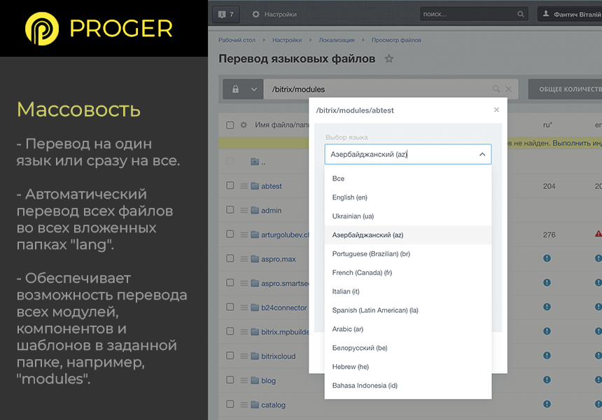 Выберите директорию с нужным модулем, и все языковые фразы этого модуля и его компонентов будут автоматически переведены. Это значительно упрощает процесс подготовки многоязычного контента.