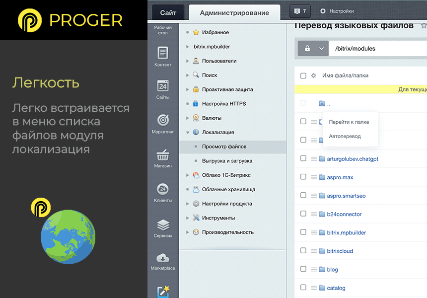 На странице "Перевод языковых файлов" в меню действий списка появляется новый пункт - "Автоперевод". Этот интуитивно понятный функционал позволяет перевести отдельные файлы или даже целые директории с минимальными усилиями.