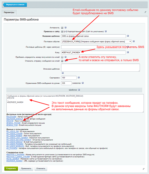 полностью настраиваемый текст СМС, в шаблоне используются макросы (например: Здравствуйте, #NAME#, Ваш заказ #ORDER_ID# на сумму #PRICE# принят, спасибо!),