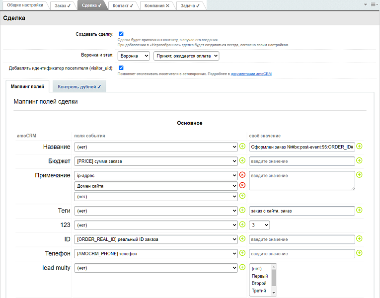 - Два способа контроля дублей со стороны модуля: встроенный бесплатный метод или с помощью платного API фильтрации амоСРМ.