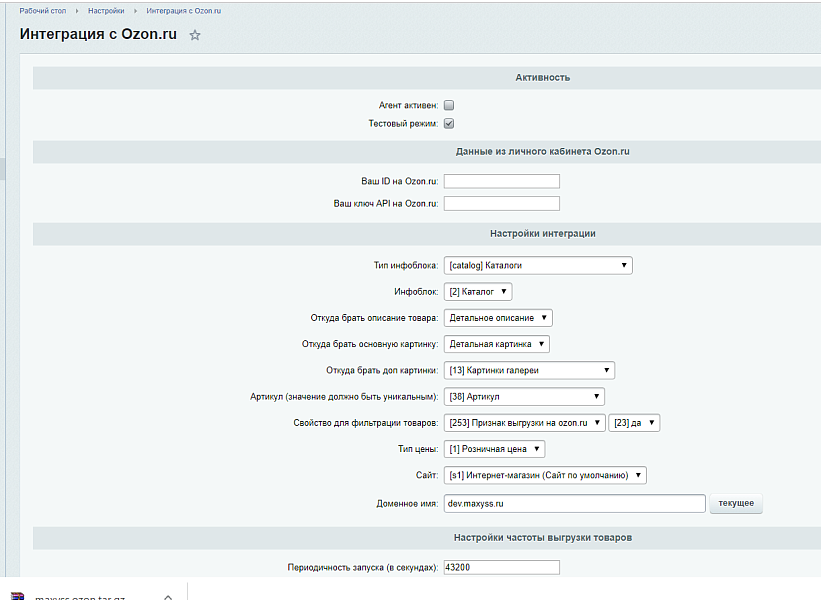 ВНИМАНИЕ! Основная задача модуля обеспечить автоматическую выгрузку на маркетплэйс ozon.ru остатков и цен товаров, а также загрузку заказов по схеме fbs и dbs. 100%-но корректная выгрузка информации по товарам (описания, картинки, свойства, бренды) в некоторых случаях не гарантирована из-за особенностей API озона.