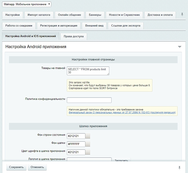 Функционал Мобильного приложения MainApp повторяет стандартный функционал 1С-Битрикс. Нестандартные настройки 1С-Битрикс рассматриваются индивидуальным образом.