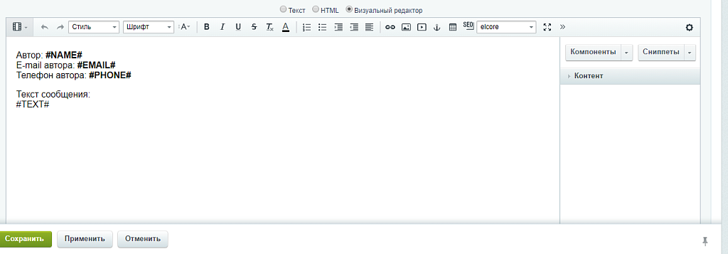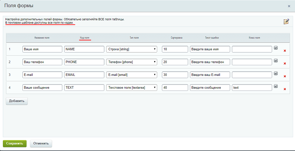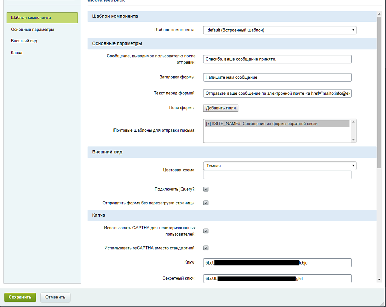Компонент создаёт поля не привязанные ни к какому инфоблоку. К каждой копии компонента можно создать свой набор полей. Прямо в настройках компонента, указать какое поле является обязательным и настроить текст ошибки, если поле не заполнено.
