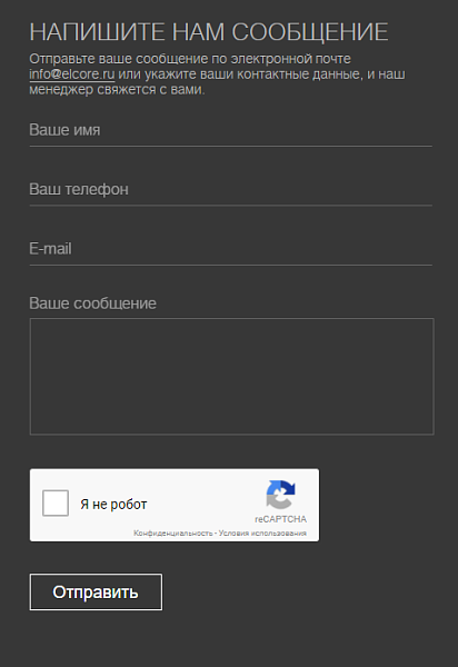 Техподдержка ведётся по электронной почте info@elcore.ru. Время работы Пн-Пт с 9-00 до 17-00 по Москве.
