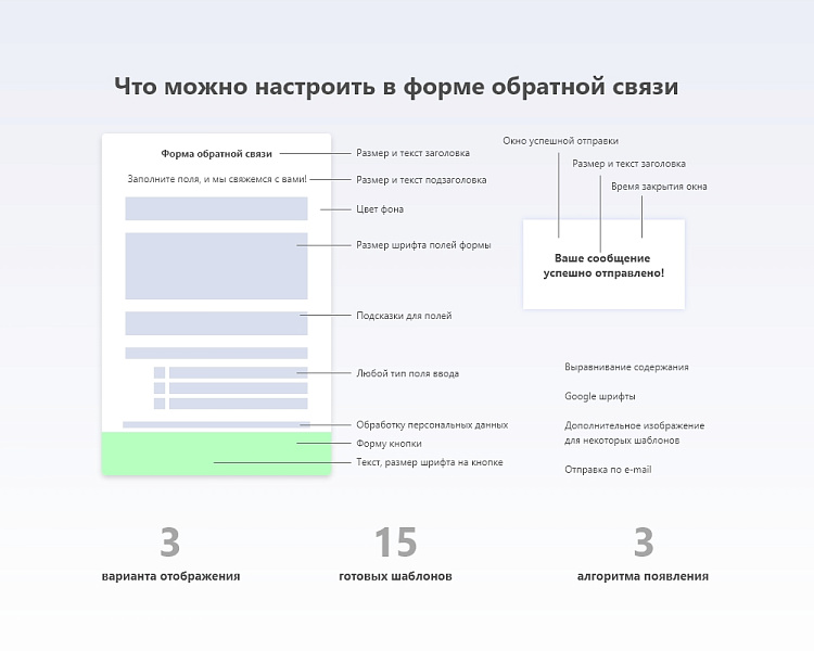 Появление формы обратной связи представлено в трех вариантах: Форма появляется только после того, как пользователь провел на сайте определенное время (5 секунд, 10, 30 секунд и т.д. - таймер настраивается), при этом страницы появления могут настраиваться индивидуально; Форма обратной связи появляется перед тем, как пользователь попытается выйти со страницы (закрыть страницу, сайт, сменить активное окно); На странице размещается кнопка, нажатие на которую сопровождается появлением формы обратной связи.