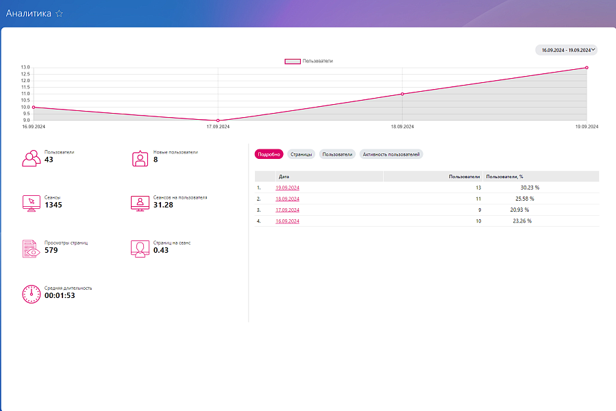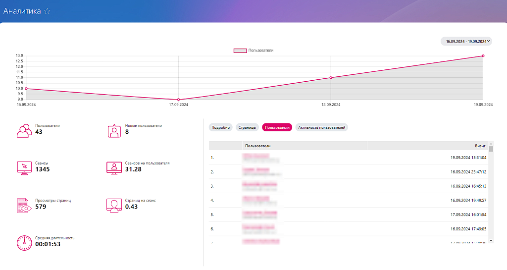 - Уникальные пользователи за указанный период. Определите, сколько различных сотрудников взаимодействует с вашей платформой. Это поможет в анализе активности и эффективности контента.