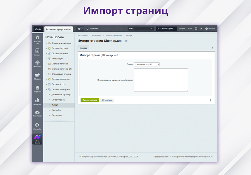 Nova Sphere: Система генерации Sitemap.xml - это инструмент, который позволяет генерировать необходимые файлы sitemap.xml с необходимыми инфоблоками, с возможностью генерации и работы с многочисленными поддоменами!