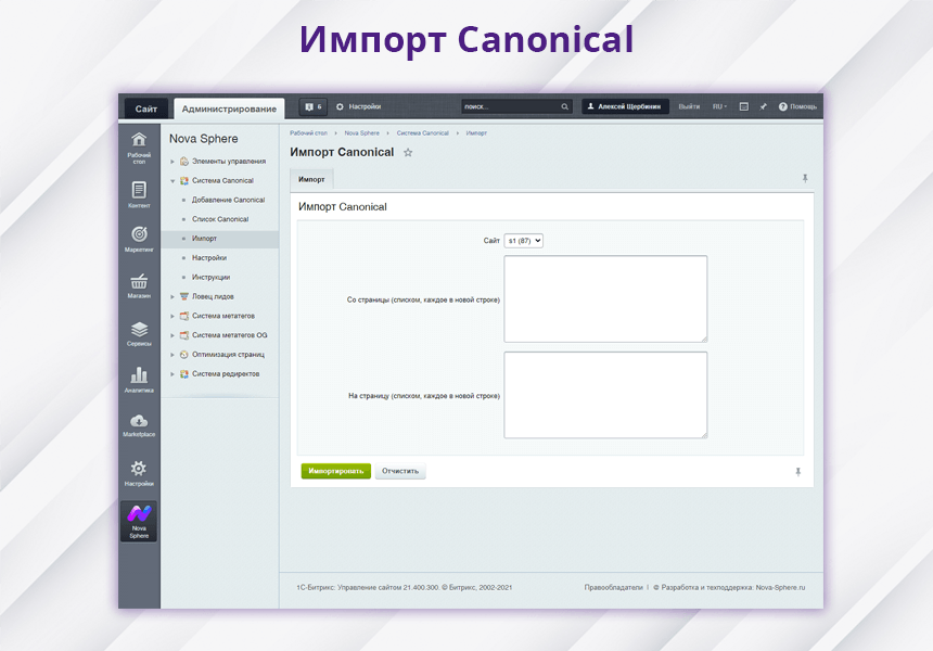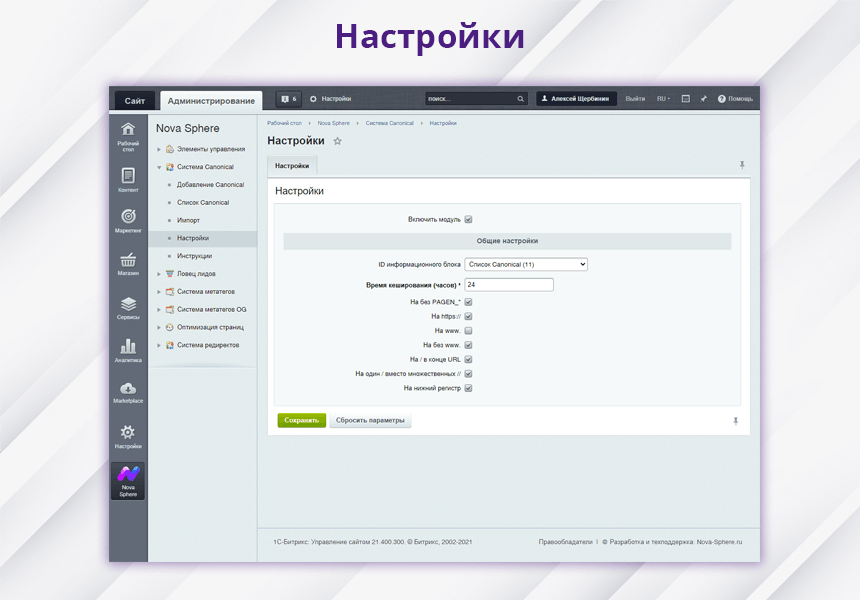 Управление настройками модуля располагается «Nova Sphere – Система Canonical – Настройки».