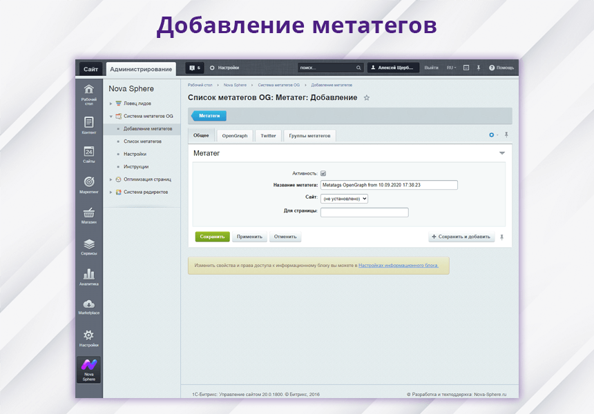 Система установки метатегов OpenGraph и Twitter - это инструмент, который позволяет установить необходимые метатеги OpenGraph и Twitter для страниц Вашего сайта с возможностью привязки к определенному сайту при многосайтовости.