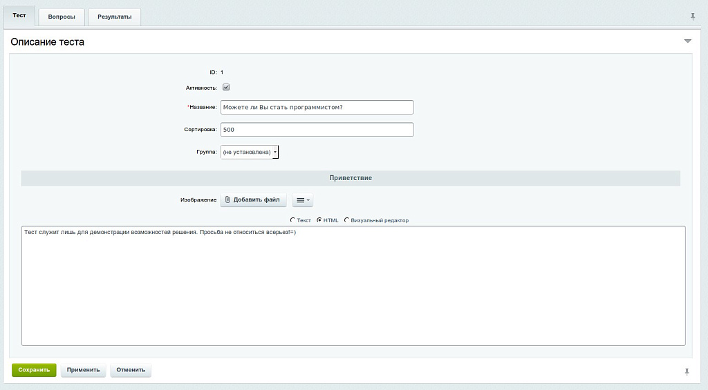 Модуль позволяет организовать тестирование, проверку знаний, организовать анкетирование, опросы, викторины и т.д.
